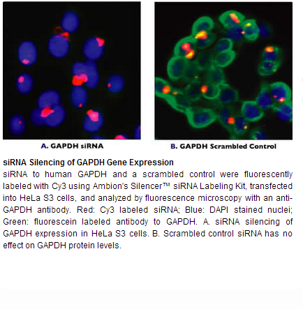 For the labeling of siRNA with Cy™3. Includes sufficient reagents for labeling 65 µg of siRNA. Ambion® Labeled siRNA can be used to analyze siRNA subcellular localization, stability, and transfection efficiency. In addition, fluorescently labeled siRNA is particularly well-suited for use in double-label experiments (with a labeled antibody) to track cells that receive siRNA during transfection and to correlate transfection with down-regulation of the target protein. Research shows that labeling of siRNAs does not affect their biological function.