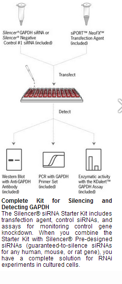 The Silencer® siRNA Starter Kit includes a high-quality, lipid-based transfection agent, siPORT™ NeoFX™, that effectively delivers siRNAs to a broad range of cell lines. It can be used for reverse transfection, a streamlined protocol that eliminates an entire day from the RNAi experimental procedure; it can also be used with standard transfection protocols. This reagent is not sensitive to serum and efficiently transfects low concentrations of siRNA. The kit also includes a well-characterized GAPDH siRNA, which has been shown to strongly down-regulate GADPH in human, mouse, and rat cells, as well as a nontargeting negative control siRNA, Silencer® Negative Control #1 siRNA. Because GAPDH is ubiquitously expressed and is easy to detect at both the mRNA and protein level, it is an ideal target for a positive control siRNA.