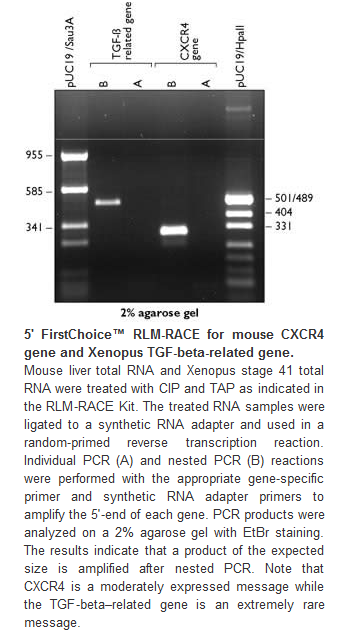 The FirstChoice® RLM-RACE Kit is designed to amplify cDNA only from full-length, capped mRNA, usually producing a single band after PCR. This kit is a major improvement over the basic rapid amplification of cDNA ends (RACE) protocol. The RLM-RACE procedure selects only full-length mRNA—no rRNA, tRNA or degraded RNA—and facilitates the cloning of sequences from the 5' ends of messages.