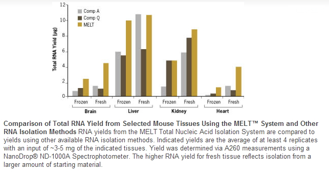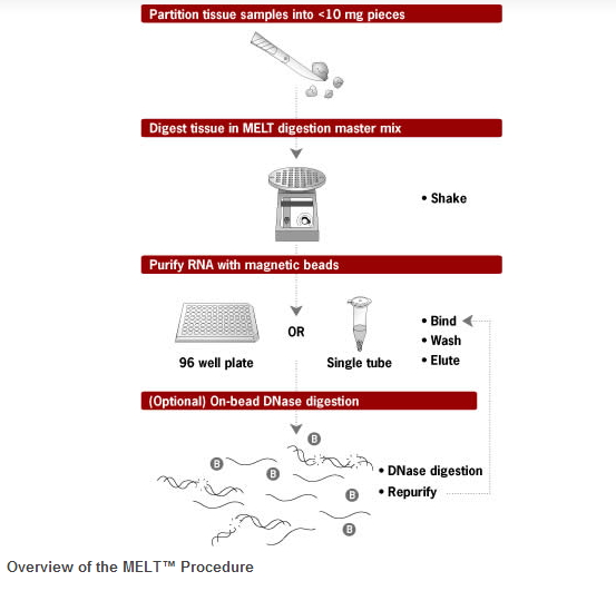 The MELT™ Total Nucleic Acid Isolation System (patent pending) offers a novel alternative to mechanical disruption of tissue as the initial step of RNA or DNA isolation. A critical step in any nucleic acid isolation protocol is freeing the RNA or DNA from the cellular architecture. The MELT™ System is a simpler and safer alternative to mechanical disruption that is amenable to high throughput tissue processing because there is no need for tedious homogenization. Samples can be processed quickly in a closed tube format that minimizes cross-contamination.
