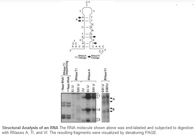 Other RNA-Grade ribonuclease available include RNase V1 (SKU# AM2275) ,which cleaves base-paired nucleotides and RNase T1 (SKU# AM2283), which cleaves 3' of single-stranded G residues. Combinations of the single- and double-stranded specific ribonucleases can provide rapid analysis of the physical structure of an interesting RNA.