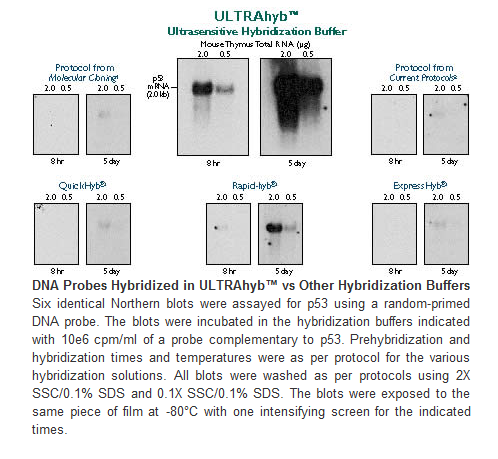 ULTRAhyb® is compatible with RNA and DNA probes labeled isotopically and nonisotopically in northerns, Southerns, and dot⁄slot blots. It contains 50% formamide and is compatible with positively charged membranes (see Accessory Products). ULTRAhyb® requires 10-100x less nonisotopic DNA probe than standard hybridization buffers, making it possible to perform many more hybridizations with a single labeling reaction.