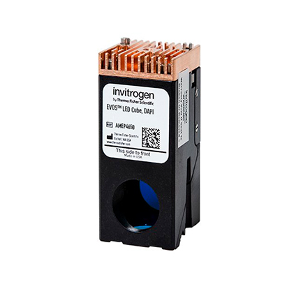 All EVOS® fluorescence imaging systems and the Countess® II FL Automated Cell Counter contain our unique, proprietary LED light cubes. This world-leading light engine outputs remarkable intensity over a short light path that delivers superior fluorophore excitation. Each cube contains an LED, condensing optics, and hard-coated filters. EVOS® light cubes are user-changeable and automatically recognized by the system. The DAPI light cube is ideal for use with Acridine, Alexa Fluor® 350, DAPI, Hoechst, NucBlue®, MarinaBlue™, Pacific Blue™ and other fluorophores with excitation and emission maxima near 357 and 447 nm.