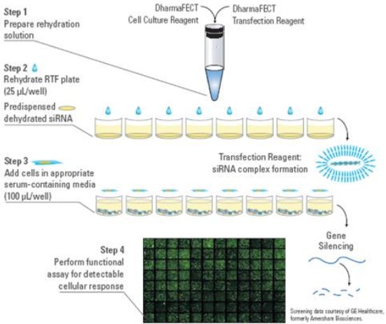 Thermo Scientific DharmaFECT Cell Culture Reagent (DCCR) is designed for dilution of DharmaFECT 1, 2, 3, or 4 Transfection Reagent prior to use in Dharmacon Reverse Transfection format (RTF) siRNA library plates. The resulting mixture is used to resuspend the pre-plated siRNA, at which time the siRNA:transfection reagent complex is formed. The plates are then ready for cells to be added in the optimal density for siRNA transfection.