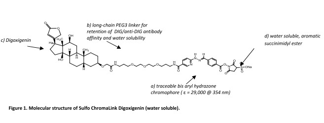 Sulfo ChromaLink Digoxigenin (DIG) incorporates UV-traceable DIG onto proteins containing lysine residues (amine groups) via a water-soluble-succinimidyl activated ester. Sulfo ChromaLink DIG has been engineered to include many novel features. As illustrated in Figure 1,the molecule’s structure contains a bis-aryl hydrazone chromophore (a), linked by a PEG3 linker arm (b), to digoxigenin (c). This reagent permits direct spectroscopic quantification of incorporated digoxigenin. The extended PEG3 linker preserves DIG/anti-DIG antibody affinity and maintains protein solubility after modification while the succinimidyl ester functional group (d), efficiently modifies lysines in aqueous buffers.