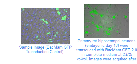 • Efficient: highly efficient (>90%) transduction of a wide range of mammalian cell lines, including primary cells, stem cells and neuronal cells • Fast and convenient: Simply add the BacMam 2.0 together with cells to your cover slip or microtiter plate, incubate overnight and assay – or store frozen, assay-ready cells for later use • Safe: non-replicating in mammalian cells, lack of observable cytopathic effect and biosafety level (BSL) 1 handling • Enables Flexiblity: co-transduce more than one BacMam reagent for multiplex experiments or co-localization studies and tightly control expression levels by just varying the dose
