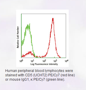 Each lot of this antibody is quality control tested by immunofluorescent staining with flow cytometric analysis. Test size products are transitioning from 20 µl to 5 µl per test. Please check your vial or your CoA to find the suggested use of this reagent per million cells in 100 µl staining volume or per 100 µl of whole blood. It is recommended that the reagent be titrated for optimal performance for each application.