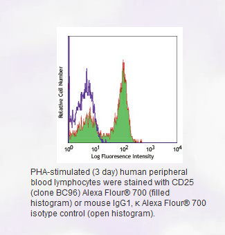 * Alexa Fluor® 700 has a maximum emission of 719 nm when it is excited at 633 nm / 635 nm. Prior to using Alexa Fluor® 700 conjugate for flow cytometric analysis, please verify your flow cytometer's capability of exciting and detecting the fluorochrome.