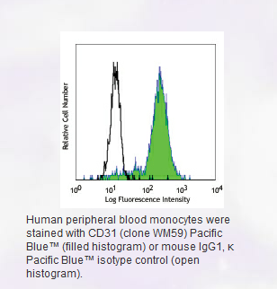 * Pacific Blue™ has a maximum emission of 455 nm when it is excited at 405 nm. Prior to using Pacific Blue™ conjugate for flow cytometric analysis, please verify your flow cytometer's capability of exciting and detecting the fluorochrome.