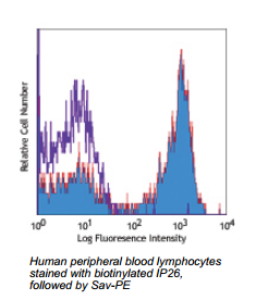 The IP26 antibody reacts with a monomorphic determinant of the a/b T-cell receptor, which is expressed on greater than 95% of normal peripheral blood CD3+ T cells. The a/b TCR recognizes a peptide bound to MHC leading to T-cell activation.