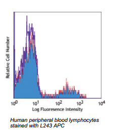 HLA-DR is a heterodimeric cell surface glycoprotein comprised of a 36 kD α (heavy) chain and a 27 kD β (light) chain. It is expressed on B cells, activated T cells, monocytes/macrophages, dendritic cells, and other non-professional APCs. In conjunction with the CD3/TCR complex and CD4 molecules, HLA-DR is critical for efficient peptide presentation to CD4+ T cells.
