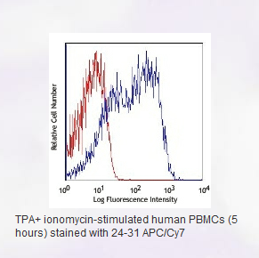 Each lot of this antibody is quality control tested by immunofluorescent staining with flow cytometric analysis. Test size products are transitioning from 20 µl to 5 µl per test. Please check your vial or your CoA to find the suggested use of this reagent per million cells in 100 µl staining volume or per 100 µl of whole blood. It is recommended that the reagent be titrated for optimal performance for each application.