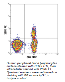 Each lot of this antibody is quality control tested by immunofluorescent intracellular staining with flow cytometric analysis. Test size products are transitioning from 20 μl to 5 μl per test. Please check your vial or your CoA to find the suggested use of this reagent per million cells in 100 μl staining volume or per 100 μl of whole blood. It is recommended that the reagent be titrated for optimal performance for each application.