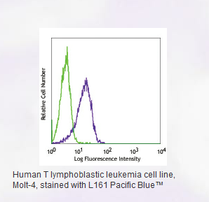 * Pacific Blue™ has a maximum emission of 455 nm when it is excited at 405 nm. Prior to using Pacific Blue™ conjugate for flow cytometric analysis, please verify your flow cytometer's capability of exciting and detecting the fluorochrome.