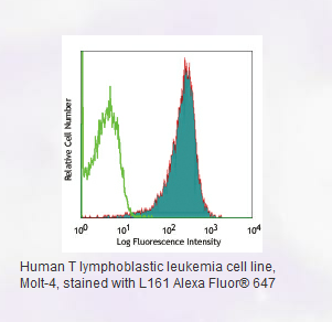 Each lot of this antibody is quality control tested by immunofluorescent staining with flow cytometric analysis. For immunofluorescent staining, the suggested use of this reagent is 5 µl per million cells or 5 µl per 100 µl of whole blood. It is recommended that the reagent be titrated for optimal performance for each application.