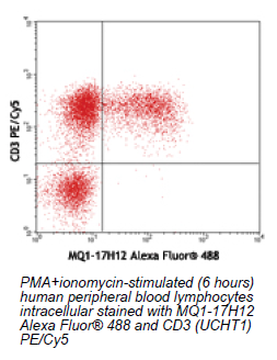 Each lot of this antibody is quality control tested by intracellular immunofluorescent staining with flow cytometric analysis. For immunofluorescent staining, the suggested use of this reagent is 5 μl per 106cells in 100 μl volume. It is recommended that the reagent be titrated for optimal performance for each application.