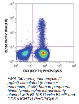 Each lot of this antibody is quality control tested by intracellular immunofluorescent staining with flow cytometric analysis. For immunofluorescent staining, the suggested use of this reagent is ≤ 1.0 μg per 106 cells in 100 μl volume or 100 μl of whole blood. It is recommended that the reagent be titrated for optimal performance for each application.