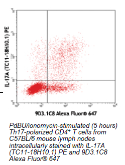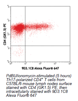 Each lot of this antibody is quality control tested by intracellular immunofluorescent staining with flow cytometric analysis. For immunofluorescent staining, the suggested use of this reagent is ≤0.25 μg per million cells in 100 μl volume. It is recommended that the reagent be titrated for optimal performance for each application.