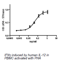 IL12 (p70) is a disulfide-linked heterodimer composed of unrelated p40 (glycosylated) and p35 subunits. IL-12 acts as a growth factor for activated human T and NK cells, enhances the lytic activity of human NK cells, and stimulates the production of IFNg by resting human PBMC. IL-12R is formed by two chains, IL-12Rb1 and IL-12Rb2. IL-12Rb1 is associated with the Janus kinase (Jak) Tyk2 and binds IL-12 p40; IL-12Rb2 is associated with Jak2 and binds either the heterodimer or the p35 chain. Signaling through the IL-12 receptor complex induces phosphorylation, dimerization, and nuclear translocation of several signal transducers and activators of transcription (STAT) family members , but most of the biological responses to IL-12 have been attributed to STAT4. IL-12 has been shown to elicit anti-tumor activity in mice and humans. It is believed that the antitumor effects of IL-12 are mediated, at least in part, by indirect mechanisms. Induction of IFN-λ results in the upregulation of class I and class II MHC molecules, adhesion molecules (ICAM-1), nitric oxide production by antigen presenting cells (APC), and the production of additional cytokines, CXCL9 and 10, which in turn mediate angiostatic effects. Cytokine detection IL-12, IL-23 and IL-35 share common subunits, utilizing combinations of p40, p19 and p35 proteins. Caution must be used when selecting antibodies and assays when specific identification, measurement, as well as activation state discrimination, is required.