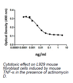 TNF-a is secreted by macrophages, monocytes, neutrophils, T-cells (principally CD4+), and NK-cells. Many transformed cell lines also secrete TNF-a. TNF-a forms multimeric complexes; stable trimers are most common in solution. A 26 kD membrane form of TNF-a has also been described. TNF-a binding to surface receptors elicits a wide array of biologic activities including: cytolysis and cytostasis of many tumor cell lines in vitro, hemorraghic necrosis of tumors in vivo, increased fibroblast proliferation, and enhanced chemotaxis and phagocytosis in neutrophils.