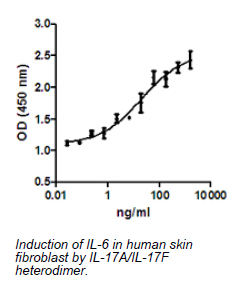 IL-17A/F is part of the IL-17 cytokine family which consists of six structurally related proteins (IL-17A, B, C, D, E, and F). IL-17A is expressed primarily by Th17 cells, a subset of CD4 T cells. IL-17F is most closely related to IL-17A. The two molecules share 50% aminoacid sequence homology. Like IL-17A, IL-17F mRNA and protein have been detected in Th17 cells. IL-17F and IL-17A exist as a homodimers, adopting a cysteine knot motif formed through the interactions of four cysteines, one of which is responsible for the interchain bonding. IL-17F and IL-17A can form both homodimeric and heterodimeric proteins when expressed in a recombinant system and all forms of the recombinant proteins have in vitro functional activity. In addition, activated human CD4-T cells produce the homodimers of IL-17F, IL-17A, and the IL-17F/IL-17A heterodimer.