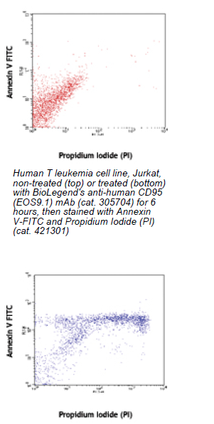 Each lot of this product is quality control tested by staining of apoptotic cells and analyzing by flow cytometry. The suggested use of this reagent is 5 μl per 1X105 cells in a 100 μl volume of Annexin V Binding Buffer (cat. no. 422201). It is recommended that the reagent be titrated for optimal performance for each application.