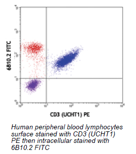 Each lot of this antibody is quality control tested by intracellular immunofluorescent staining with flow cytometric analysis. For immunofluorescent staining, the suggested use of this reagent is ≤ 0.5 μg per 106 cells in 100 μl volume. It is recommended that the reagent be titrated for optimal performance for each application.