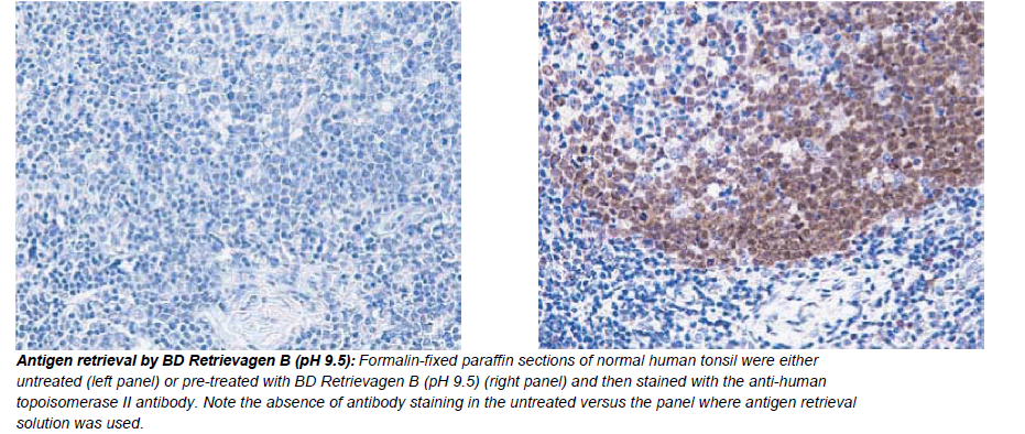 BD Retrievagen B (pH 9.5) is an antigen retrieval system that is recommended for Zinc-fixed and Formalin-fixed paraffin embedded tissue