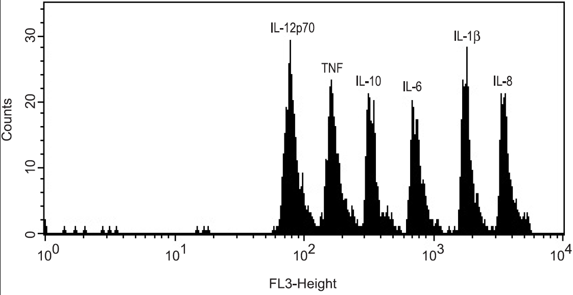 The BD™ CBA Human Inflammatory Cytokines Kit can be used to quantitatively measure interleukin-8 (IL-8), interleukin-1β (IL-1β), interleukin-6 (IL-6), interleukin-10 (IL-10), tumor necrosis factor (TNF), and interleukin-12p70 (IL-12p70) protein levels in a single sample. The kit performance has been optimized for analysis of specific proteins in tissue culture supernatants, EDTA treated plasma, and serum samples using one of two protocols, depending on the sample source. The kit provides sufficient reagents for 80 tests.