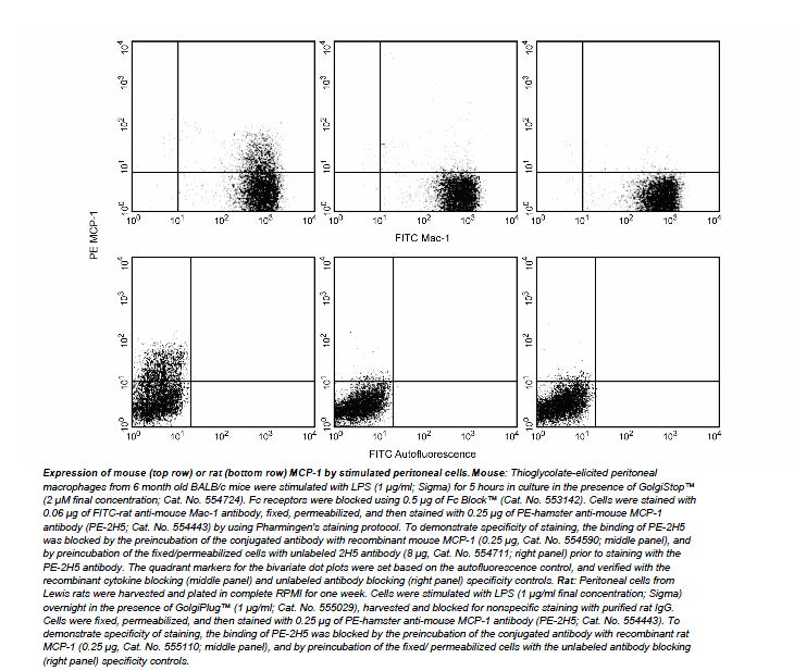 The 2H5 antibody reacts with mouse and rat monocyte chemoattractant protein (MCP-1), formerly termed JE. This antibody also recognizes