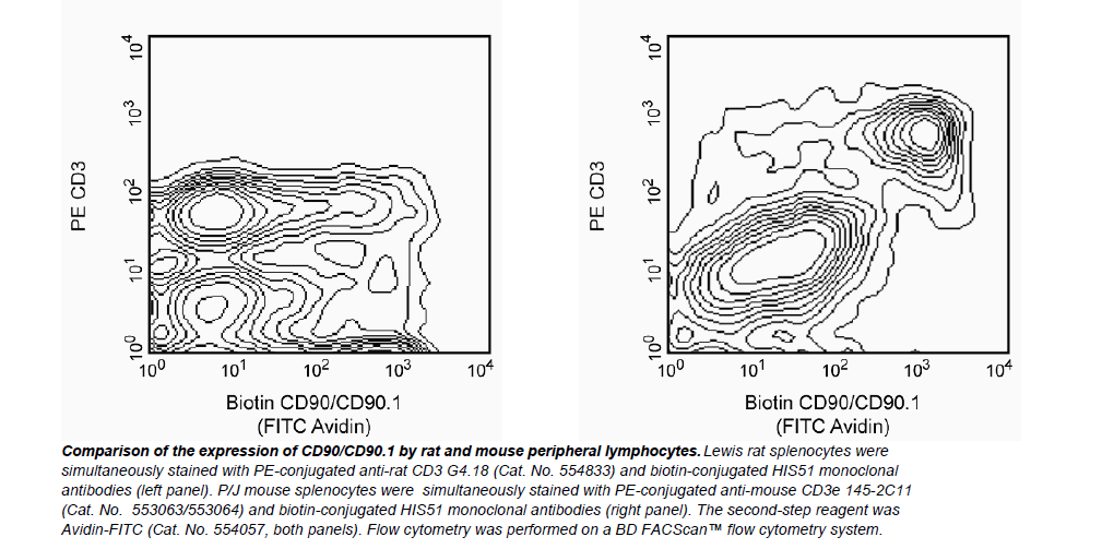 HIS51 antibody cross-reacts with the mouse Thy-1.1 alloantigen of the AKR/J and PL strains, but not Thy-1.2 found on most strains. In the