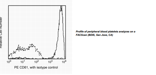 The VI-PL2 monoclonal antibody specifically binds to CD61. CD61 is a 105 kDa transmembrane glycoprotein that is also known as integrin β3 and platelet glycoprotein IIIa (GPIIIa or GP3A). It is expressed on platelets, megakaryocytes, osteoclasts and endothelia. Integrin β3 associates with gpIIa (CD41) to form the CD41/CD61 complex which mediates platelet adhesion and aggregation. CD61 also associates with CD51 to form the CD51/CD61 complex (vitronectin receptor). CD61 appears to bind to fibrinogen, fibronectin, vWF, vitronectin, and thrombospondin to mediate cell adhesion.