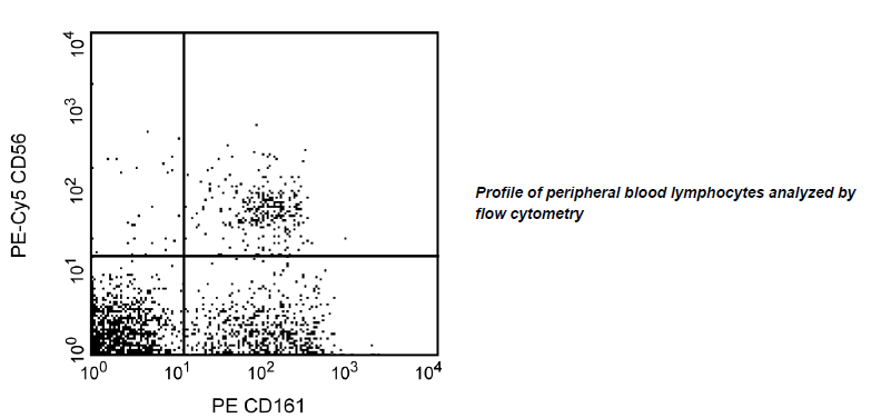 Reacts with an 80 kD disulfide-linked homodimer, type II membrane glycoprotein, also referred to as NKR-P1A. CD161 is expressed on most