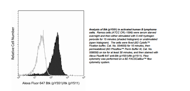 Bruton's tyrosine kinase (Btk) is a nonreceptor tyrosine kinase whose function is critical for proper B cell development and signaling. The activity of Btk is regulated by Src mediated phosphorylation of the kinase domain at tyrosine 551 (Y551). This event induces Btk kinase activity and subsequent autophosphorylation at Y223. Phosphorylated Btk then associates with the cell membrane via the interaction of the PH domain with phosphatidylinositol 3, 4, 5-triphosphate. The Tec family kinase Itk plays a critical role in signal transduction downstream of the T cell antigen receptor and has been implicated in the activation of phospholipase C-γ1 (PLCγ1), a key regulator of calcium mobilization and extracellular signal-regulated kinase (ERK) activation. Itk is regulated by an activating transphosphorylation event in which Y511 in the kinase domain is phosphorylated by Lck.