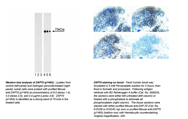 The 70-kDa ζ chain-associated protein (ZAP70) is a protein tyrosine kinase (PTK) that associates with the ζ subunit of the T cell antigen receptor (TCR) and undergoes tyrosine phosphorylation following TCR stimulation. ZAP70 contains two SH2-like domains with the PTK domain located at the C-terminus. It appears that both ZAP70 and Syk are recruited to the phosphorylated CD3 and ζ subunits after TCR stimulation. TCR-mediated Lck activity leads to phosphorylation of ZAP70 on Tyrosine 493 (Y493) in the regulatory loop of the kinase domain leading to upregulation of ZAP70 kinase activity. The significance of ZAP70 activation in mediating TCR signal transduction has been confirmed by showing that ZAP70 activity is absent in an autosomal recessive form of severe combined immunodeficiency (SCID). This is due to mutations affecting the ZAP70 kinase domain which affect the stability of the protein and TCR signaling.