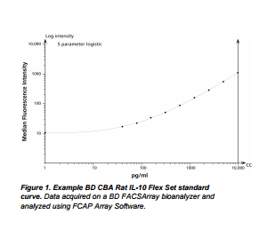 This BD™ CBA Flex Set contains one vial each of Capture Bead and PE Detection Reagent and two vials of Standard. The Capture Bead and PE Detection Reagent components of this flex set have been formulated to a 50x concentration to ensure product performance when multiplexed. The Standard component is lyophilized and should be transferred to a 15 mL polypropylene tube for reconstitution. When reconstituted in 4.0 mL Assay Diluent, the standard has a protein concentration of 10,000 pg/mL. Discard unused reconstituted standard, do not store or reuse. Store lyophilized standard and other components at 4°C. Protect Capture Beads and the PE Detection Reagent from prolonged exposure to light.
