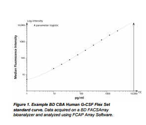 The BD™ CBA Human G-CSF Flex Set is a bead-based immunoassay capable of measuring human Granulocyte-Colony Stimulating Factor (G-CSF) in serum, plasma, and cell culture supernatant samples. Human reactivity was determined by testing samples with the BD CBA Human G-CSF Flex Set. The biology and function of G-CSF has been extensively reviewed in the literature. For more information on bead-based immunoassays, refer to the product insert for the BD CBA Human Soluble Protein Master Buffer Kit (Cat. No. 558264 or 558265).