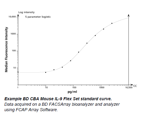 The BD™ CBA Mouse IL-9 Flex Set is a bead-based immunoassay capable of measuring mouse interleukin-9 (IL-9) in serum and cell culture