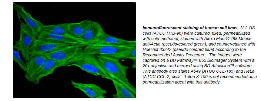 The monoclonal antibody was purified from tissue culture supernatant or ascites by affinity chromatography. The antibody was conjugated to Alexa Fluor® 488 under optimum conditions, and unreacted Alexa Fluor® 488 was removed. Store undiluted at 4°C and protected from prolonged exposure to light. Do not freeze.