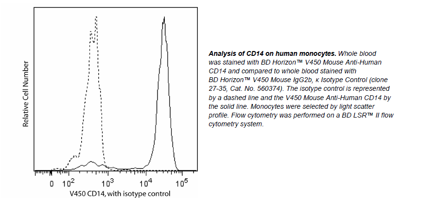 The antibody is conjugated to BD Horizon™ V450, which has been developed for use in multicolor flow cytometry experiments and is