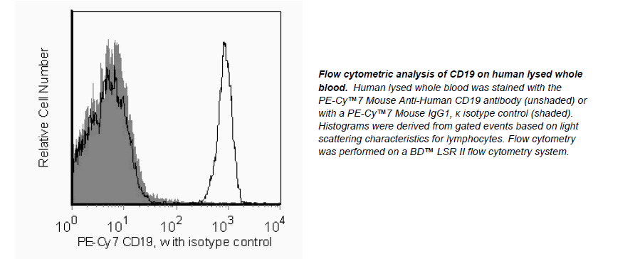 The HIB19 monoclonal antibody specificially binds to the 95 kDa type I transmembrane CD19 glycoprotein. CD19 is expressed during all