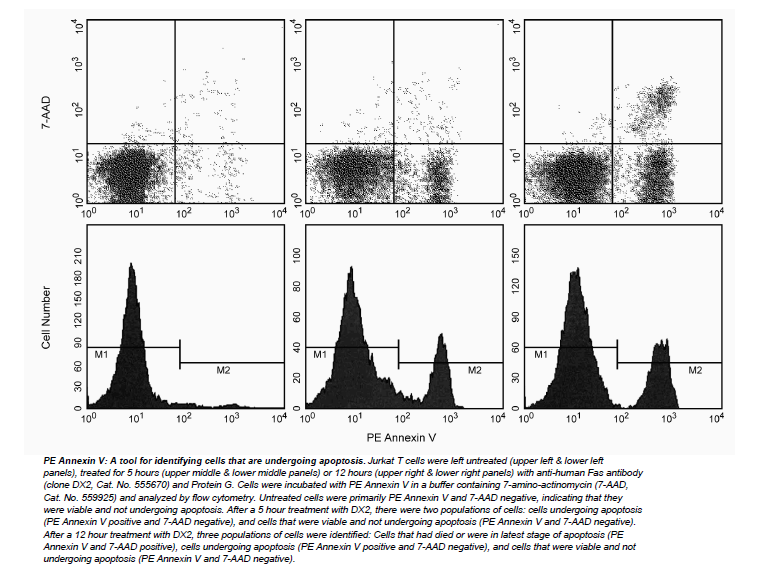7-Amino-Actinomycin (7-AAD) to allow the investigator to identify early apoptotic cells (7-AAD negative, PE Annexin V positive). Viable
