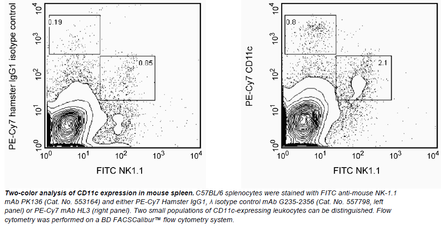 2.PE-Cy7 is a tandem fluorochrome composed of R-phycoerythrin (PE), which is excited by 488-nm light and serves as an energy donor,coupled to the cyanine dye Cy7, which acts as an energy acceptor and fluoresces maximally at 780 nm. PE-Cy7 tandem fluorochrome