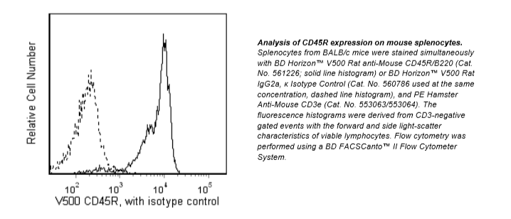 The rat anti-mouse CD45R antibody (clone RA3-6B2) has been reported to react with an epitope on the extracellular domain of the