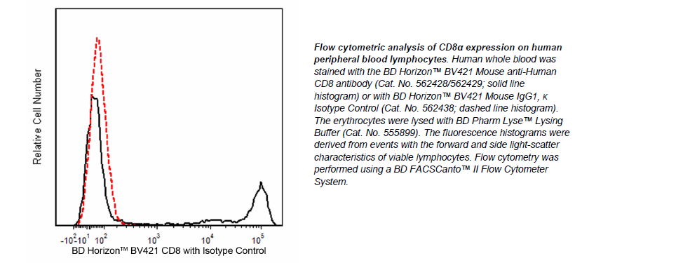 The antibody was conjugated to BD Horizon BV421 which is part of the BD Horizon Brilliant™ Violet family of dyes. With an Ex Max of