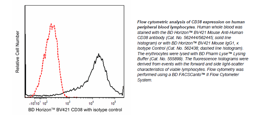 The antibody was conjugated to BD Horizon™ BV421 which is part of the BD Horizon™ Brilliant Violet™ family of dyes. With an Ex Max