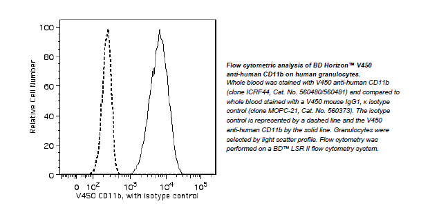 The antibody is conjugated to BD Horizon™ V450, which has been developed for use in multicolor flow cytometry experiments and is