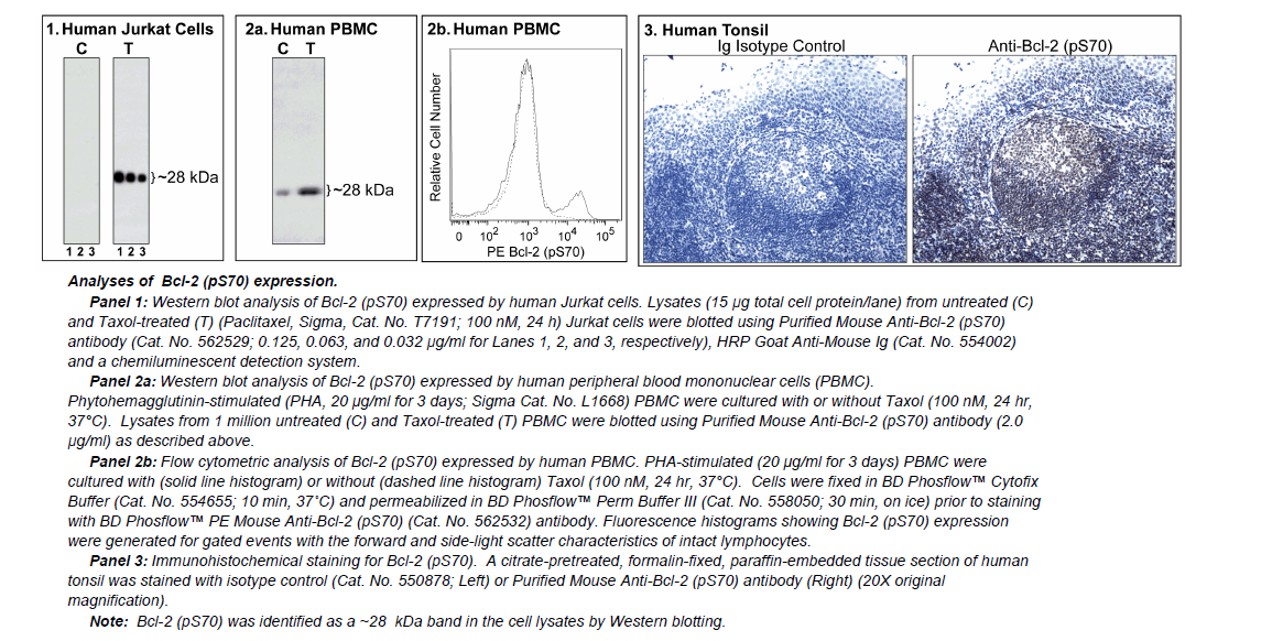 phosphorylation sites including Thr56, Ser70, Thr74 and Ser87. Phosphorylation of Bcl-2 Ser70 has been shown to be a mitotic marker.