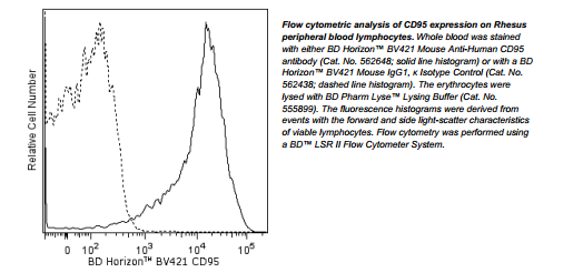 The antibody was conjugated to BD Horizon™ BV421 which is part of the BD Horizon™ Brilliant Violet™ family of dyes. With an Ex Max
