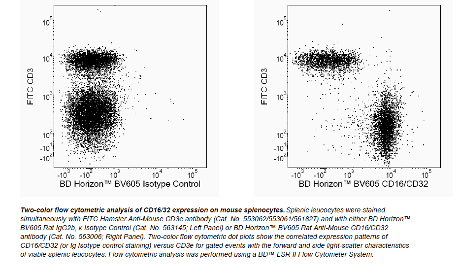 This antibody is conjugated to BD Horizon BV605 which is part of the BD Horizon Brilliant™ Violet family of dyes. With an Ex Max of
